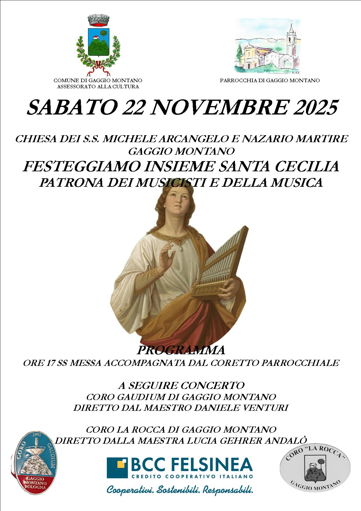 Sabato 22 Novembre 2025, a partire dalle ore 17.00 presso la Chiesa Parrocchiale di Gaggio Montano Santa Messa animata dal coretto parrocchiale e a seguire concerto dei cori “Gaudium” e “La Rocca” di Gaggio Montano. clicca qui